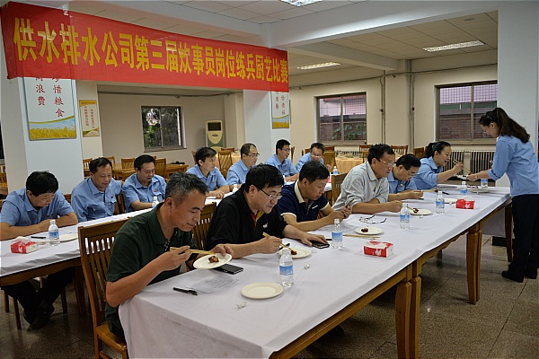 9月15日,公司第三届炊事员岗位练兵厨艺比赛在机关食堂举办。3个食堂分别制作6道规定菜品,1道自选菜品,待14名评委品菜完毕后,逐个逐项打分,激烈角逐之后,各队均取得了优异成绩,供水厂食堂以95.2分夺得第一名,机关、污水食堂以94.8分、94.1分获第二、三名。此次比赛由后勤处组织,宣传部、党群工作部、工会、督察处协助。