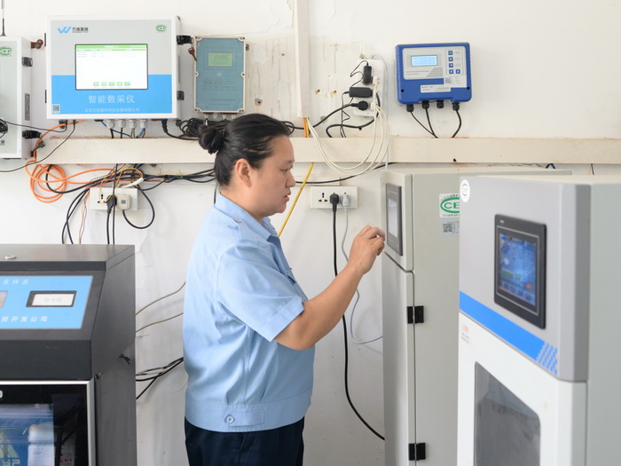 在省四院(东院)污水处理站,笔者看到从上一个站点赶到这里的陈家玉正在观察进水量,查看在线数据并记录各项参数。她告诉笔者,污水处理站虽小,但所涉及的工艺设备一样都不少,要根据进出水量、污泥活性等要素确定加药量、碳源投加量、曝气量和回流量,保持进水、出水平衡,确保出水稳定达标排放。像四院这样的污水处理站,设有在线间、格栅间、过滤间、调节池、沉淀池、好氧池、厌氧池等,麻雀虽小五脏俱全,是缩小版的污水处理厂。她很喜欢污水处理站这项具有挑战性的工作,在这里锻炼了独当一面的本领,学会了如何与外界沟通,学会了排除设备故障和设备维修,这一切让她更加乐观和自信。